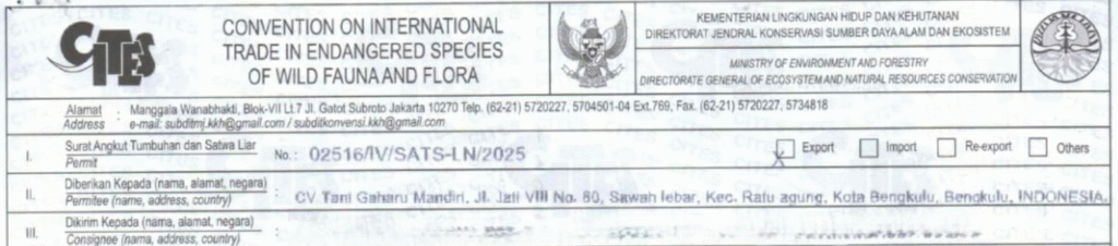 CV. Tani Gaharu Mandiri, a legally certified agarwood company including Export license, Environmental permits, Certificate of origin from indonesian quarantine authority and Convention on international trade in endangered species of wild fauna and flora. proudly holds licenses that authorize official trade of agarwood domestically and internationally.