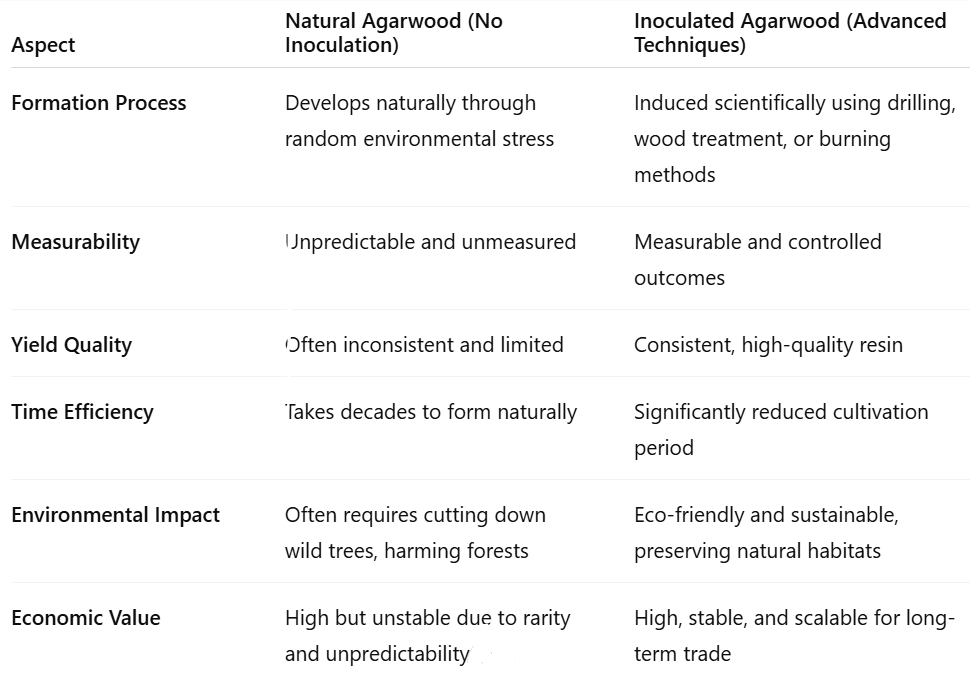 When compared to wild agarwood, which develops without inoculation, the advantages become clear. Natural agarwood growth is unmeasured, highly dependent on random environmental factors, and frequently yields limited or inconsistent resin quality. In contrast, agarwood produced through advanced inoculation techniques is predictable, efficient, and more sustainable. It maximizes output without harming the ecosystem, offering both superior quality and environmental friendliness.